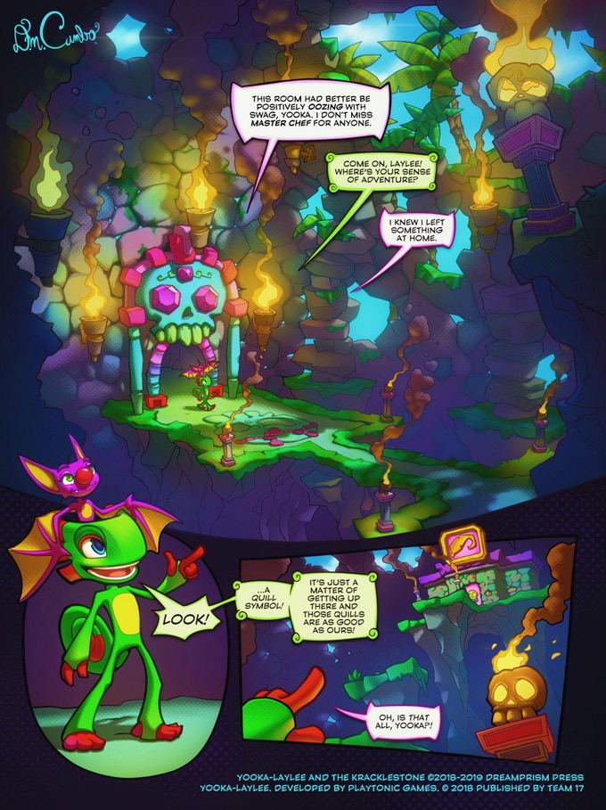 Seit 2014 arbeitet D.M. Cumbo an Graphic Novels und illustrierten Büchern. Yooka-Laylee entsteht seit zwei Jahren in enger Zusammenarbeit mit Paytonic Games, um der Welt und den Charakteren möglichst gerecht zu werden und ihnen eine plausible Erweiterung an die Hand zu geben. Seine Herangehensweise zieht Dave aus jahrelanger Design Arbeit als Game-Designer bei Insomniac. Seine Handschrift tragen viele Ratchet & Clank Titel, ebenso wie Resistance und Sunset Overdrive. Da er sich nun auch Hauptberuflich den Graphic Novels und dem Kracklestone Abenteuer widmen möchte, hat Cumbo eine Kickstarter Kampagne gestartet, in der du ihn bei seiner Umsetzung finanziell unterstützen kannst, damit das Buch im Sommer 2019 erscheinen kann. Es warten viele Goodies auf dich, aber vor allem ein herausragendes Buch mit tollen Illustrationen und einer spannenden, lebendigen Geschichte.