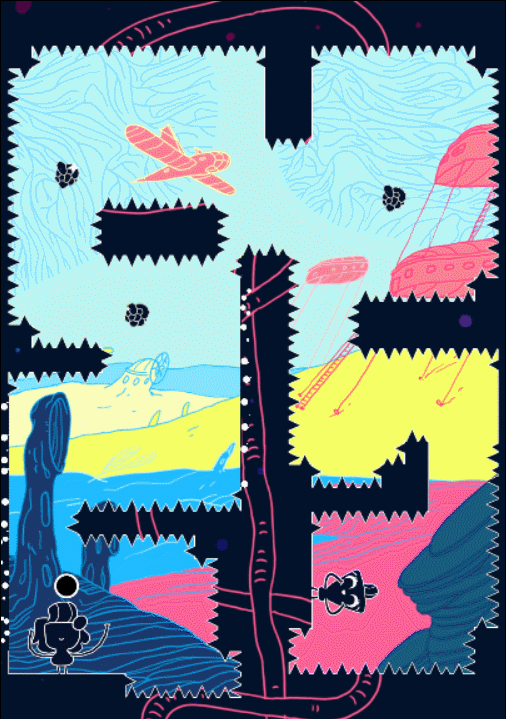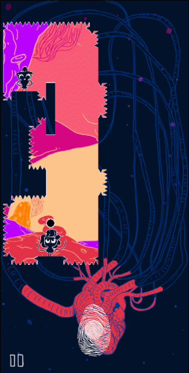 Was passiert also, wenn dich nicht nur ein Spitkisser-Pfeil mitten ins Herz trifft, sondern gleich noch ein zweiter? Spitkiss erzählt genau das leichtfüßig und quietsche bunt. Die Spitkisser wohnen in einem fremden Körper und kommunizieren nicht nur über ihren Speichel, sie tauschen auch Gefühle und Zärtlichkeiten in dieser Form aus. Damit das unfallfrei funktioniert, bist du für die Navigation der kostbaren Fracht (Spucke) durch die liebevoll gestalteten, minimalistischen Level zuständig. Ganz intuitiv benutzt du deinen Finger, um die Richtung des Spucke-Balls festzulegen. Zwischen Zeitlupe und flummiartigen Abprallern musst du deine Gehirnzellen ein wenig in Schwung bringen, um im Mix aus Puzzle und Jump & Run voranzuschreiten. Hast du eine Reihe von Level erfolgreich abgeschlossen, wirst du mit zuckersüßen Comicpanels belohnt, die die Liebesgeschichte von Ymer erzählen und weiter ausschmücken – die Person, in der die Spitkisser wohnen. Ein kunterbunter Hybrid aus narrativer Comicerzählung und Präzisionsplattforming.