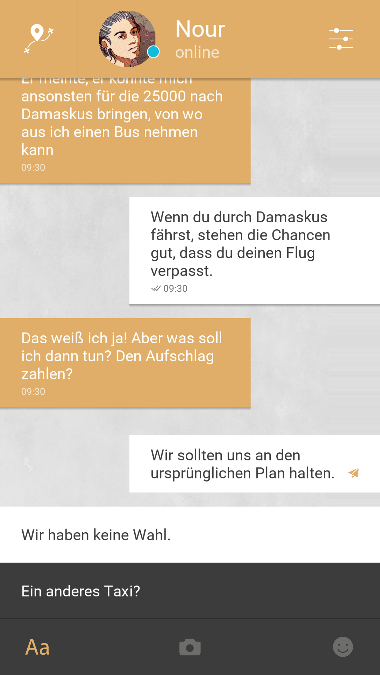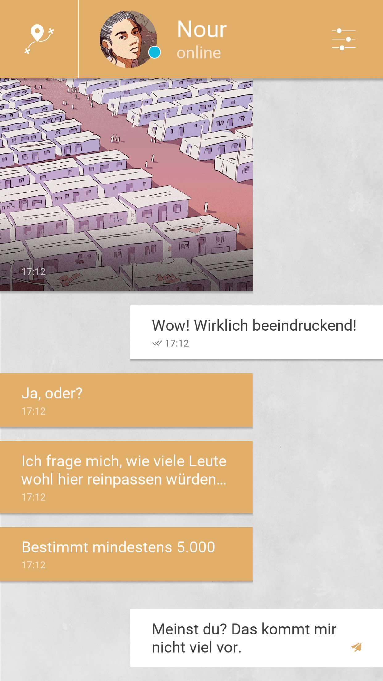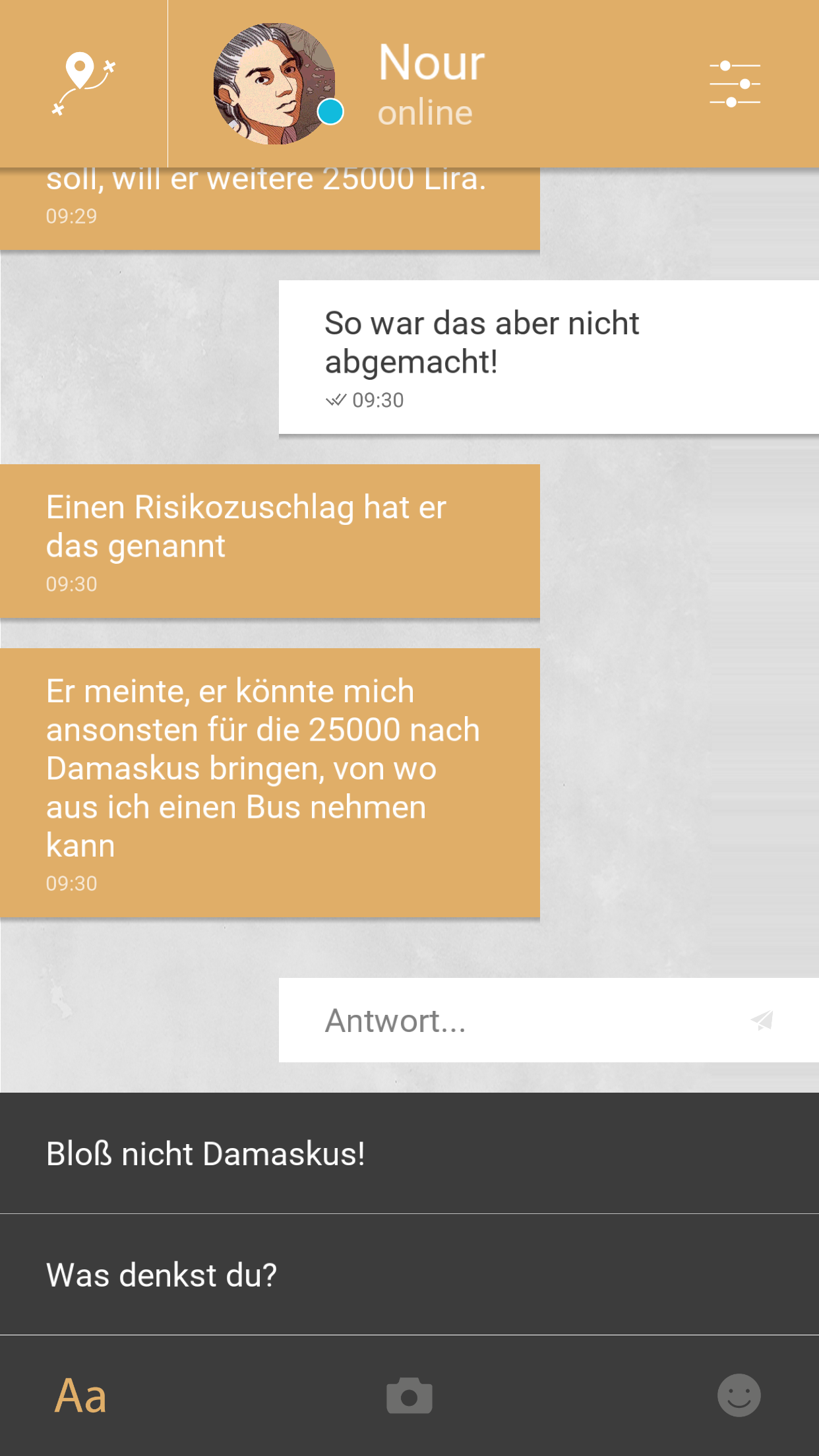 Das zentrale Element Smartphone sah die Game-Designerin Florent Maurin als geeignetes Tool, um die gelebte Realität der flüchtenden Menschen in eine narrative, interaktive Geschichte einzuweben und Nachvollziehbarkeit zu teilen. So entstand in dieser Zusammenarbeit Bury Me, My Love bei The Pixel Hunt mit Unterstützung von Playdius, ARTE und Figs. Die mobile Version nutzt zudem die Echtzeit. Ganz wie bei deinen liebsten Menschen, meldet sich Nour verteilt über den Tag, manchmal geballt, in manchen Fällen auch lange gar nicht. Doch immer wenn sie dir schreibt, wirst du benachrichtigt.