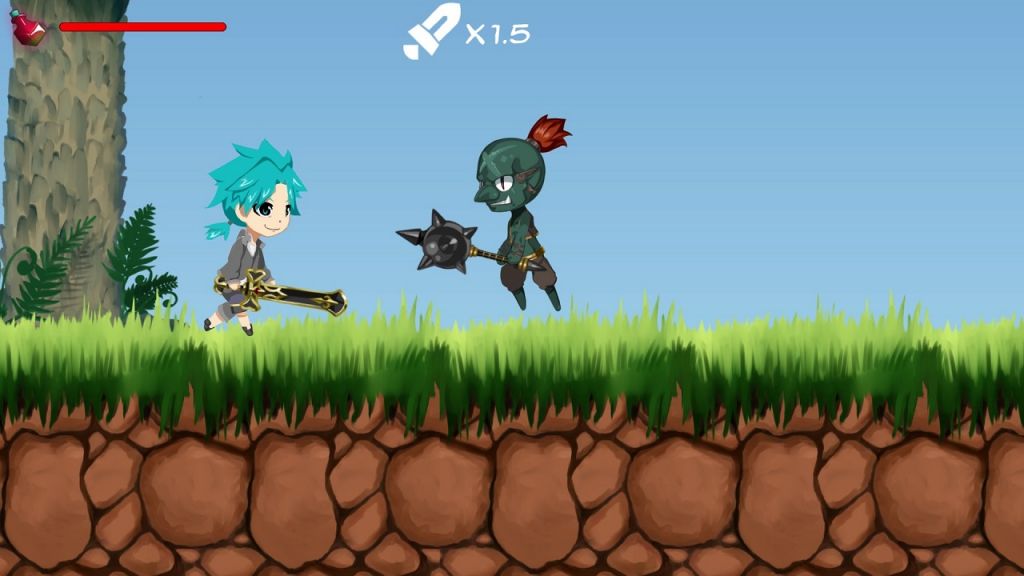 Es gibt drei Grundwelten, die in vier Abschnitte aufgeteilt wurden. Wenn du gut durchkommst ist jedes Level ca. eine Minute lang. Monsterarten wechseln mit der Welt, sind aber alle völlig homogen und, äh – ja hier wird es tatsächlich schwierig einen passenden Begriff für die geringe Dichte an grauen Zellen in deren Schädeln zu finden – etwas unterdurchschnittlich langsam in der Fähigkeit Dinge zu lernen und auszuführen? Das läuft dann immer wieder höchst interessant ab. Ein Monster kommt dir entgegen, bleibt kurz vor dir stehen und schwingt sein Schwert einmal. Ein paar Sekunden später das zweite Mal. Hättest du Lust gehabt die Abstände zwischen den Schlägen zu messen, es wäre vermutlich im ganzen Spiel bei jedem Monster exakt der selbe. Individuelle Programmierung, was ist das? Das gibt dir die Chance einfach drauf loszuhacken. Immer weiter hacken! Hacken, hacken, hacken. Auch wenn das in Verbindung mit dem niedlich gestalteten Artdesign völlig paradox klingt. Bist du schnell genug, hast du den Gegner erledigt, bist du es nicht, verschwindet ein winziges Stückchen deiner Lebensenergie. Am Anfang des Spiels absolut verkraftbar. Dafür gibt es ja die tollen Tränke, die der Osterhase in der Welt verteilt hat.
