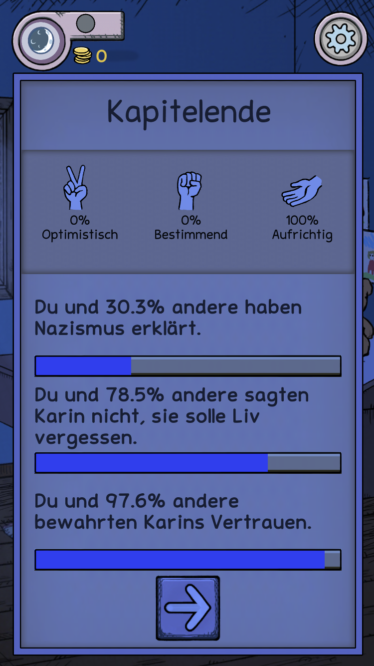 Nach einigen Tagen geht ein Kapitel zu Ende und der Statistik-Screen zeigt, zu wie viel Prozent optimistisch, bestimmend oder aufrichtig mit Karin umgegangen wurde. Je mehr sie von ihrer Vergangenheit erfährt, desto mehr möchte das Kind ihre Eltern kennen lernen oder wenigstens erfahren, warum sie so von allen behandelt wird. Die moralischen Entscheidungen und insbesondere der Umgang der Schüler und sogar der Lehrer mit Karin treffen mitten ins Herz. Um Karins Wunsch zu erfüllen wird eine Briefkorrespondenz mit den Eltern, Großeltern und dem Pfarrer aufgenommen, damit Karin erfährt wo sie herkommt. Gleichzeitig erscheinen aktuelle Ereignisse aus Norwegen in der Zeitung und im Tagebuch wird verfasst, was die Nazis in Norwegen verbrochen haben. Karin kann all das nachlesen, sobald sie alt genug ist.