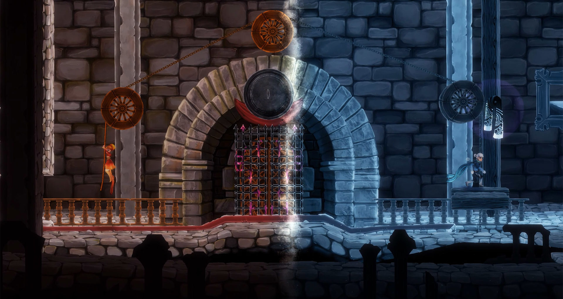 Degrees of Separation spielt sich zu Anfang wie ein recht geradliniger Platformer. Doch hast du die erste Welt überstanden, kommst du an einem geheimnisvollen Schloss an, in dem Türen zu verschiedenen Welten für dich bereitstehen. Viele davon sind verschlossen und lassen sich erst öffnen, nachdem du genügend Schals gefunden hast. Diese sind in Puzzle-Sektionen der Welten immer wieder versteckt und mutieren zum eigentlich Ziel des Spiels. Auferlegte Sammelleidenschaft quasi. Die Levelstrukturen werden zunehmend unstrukturierter, offener und erinnern an Labyrinthe des Metroidvania Genres. Oft findest du dich also in bereits gespielten Welten wieder, um weitere Schals zu suchen und in dessen Folge die Möglichkeit zu bekommen, weitere Tore zu öffnen. Das kann natürlich unglaublich motivierend wirken, doch bei der repetitiven Struktur der Welten, in denen Puzzle recht ähnlich aufgebaut wurden und du ständig an Seilen hängst, wirkte das zumindest auf mich äußerst ermüdend. Zudem erscheinen sich ständig wiederholende Räder, Flaschenzüge und Seile inmitten der Natur wenig organisch. Ich bin aber auch einfach kein Metroidvania Fan und im Coop mag das sogar wieder herausfordernd sein.