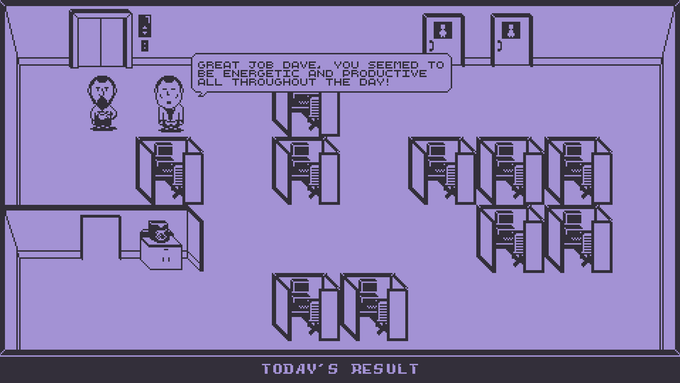 Dinge einsammeln und andere vermeiden? Das gab es doch schon mal zu Beginn der Videospielära? In Pac-Man sammelst du Pillen und Früchte, vermeidest aber aggressive Geister. Zumindest zum Großteil. Du kennst das. In Dave-Man sammelst du Kaffeebohnen und versucht zeitraubende Kommunikation zu vermeiden, die dich am Ende des Tages dein Gehalt kostet. Erst wenn alle Kaffeebohnen eingesammelt wurden kann der Kaffee in der Kaffeemaschine frisch aufgebrüht werden. Der Unterschied? In Pac-Man konntest du dich wenigstens manchmal gegen die Angriffe der Geister wehren und sie in kurzen Phasen verspeisen. Mit deinen Kolleg_innen auf der Arbeit kannst du das leider nicht. Triffst du auf eine der Chatty-Cathies ist dein Tag gelaufen. Der Schwierigkeitsgrad wird unmittelbar angehoben.