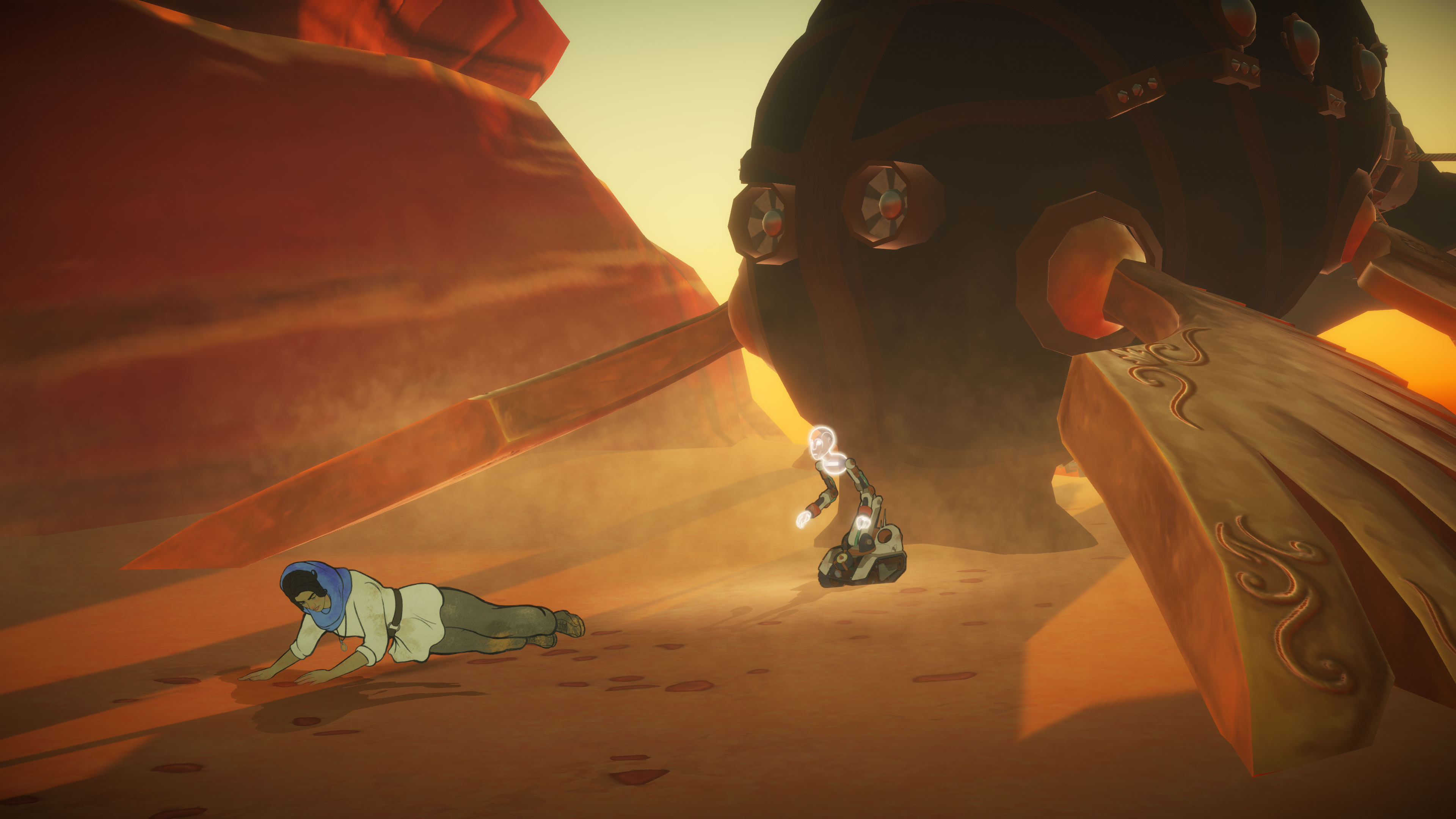 Heaven’s Vault ist als frei erkundbare Welt gedacht. Eine Welt, in der du deine Geschichte selber entwickelst. Doch zu oft hast du das Gefühl, dass dich Inkles narratives Abenteuer eigentlich gar nicht so frei erkunden lassen will. Oft ist nach der Erkundung eines Planeten nur ein reisefähiger Ort auf der Karte markiert. Planetenareale werden künstlich eingeschränkt, manchmal wirken sie leer und zumeist eher schlauchig. Zwar kannst du deine Erkundung innerhalb der Welten frei gestalten, doch irgendwie wirst du das Gefühl nicht los, dass deine freie Entscheidung der storytechnischen Entwicklung weichen muss. Zudem ist dein begleitender Roboter äußerst ungeduldig und fragt in regelmäßigen Abständen, ob ihr diesen Mond denn nun verlassen könntet. Es schleichen sich Passagen ein, in denen du das Gefühl hast, nicht allzu viel zu tun zu haben, das entweder der Geschichte oder dem Teil des Übersetzens irgendwie förderlich wäre. Heaven’s Vault wird hier eher zur individuellen aber linearen Erzählung mit leicht ausladenden Arealen zur Erkundung. Manchmal sind Monde auch wenig besuchenswert, also eher weniger vielfältig. Aber das ist dann wieder der völlig normale Alltag einer Archäologin. Es ist eben nicht jeder Tag ein unglaubliches Abenteuer. Wieder einmal wird das Segeln zum Beweis für wenig Freiheit. Die Richtung deiner Route wird bei jeder Abzweigung angezeigt. Verpasst du die richtige Abzweigung, kannst du nicht etwa einen anderen, neuberechneten Weg nutzen, sondern wirst zurück auf die ursprüngliche Route versetzt.