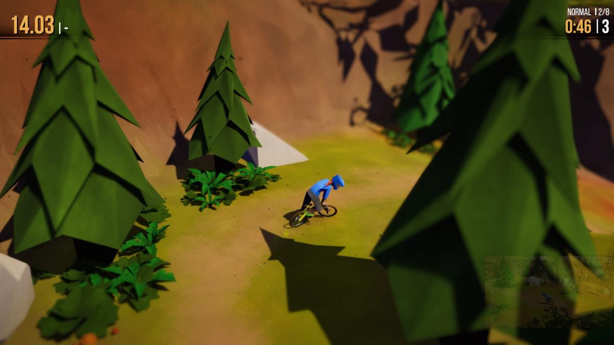 Vorbei an Felsen, über enge Pfade fegend und tiefe Schluchten fliegend. Über den perfekten Run oder gebrochene Beine entscheidet schon das kleinste Steinchen oder der minimalste Konzentrationsaussetzer. Doch auch im tiefsten Fall fliegt stets die Ästhetik des Kontrollverlustes mit und gönnt sich wildgewordene, eckige Blutpolygone als Triumph der Unachtsamkeit.