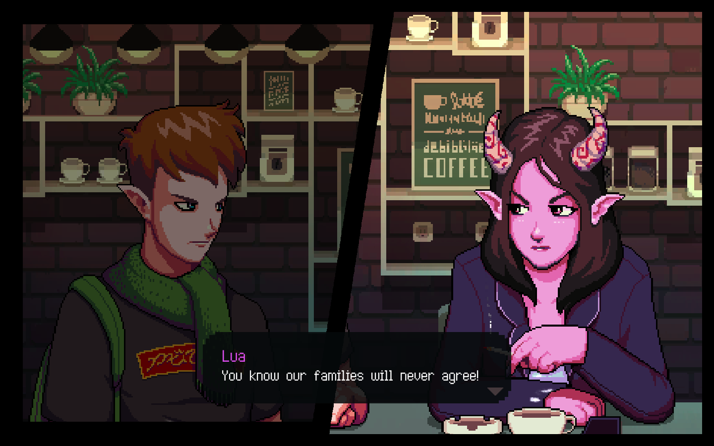 Über Kaffee lässt sich auch so manches Problem lösen oder wenigstens im ersten Schritt schon mal ansprechen. Lua und Baileys zum Beispiel sind schon lange ein Paar, aber Lua’s Succubus-Eltern würden womöglich nie erlauben, dass ihre Tochter einen Elfen heiratet.