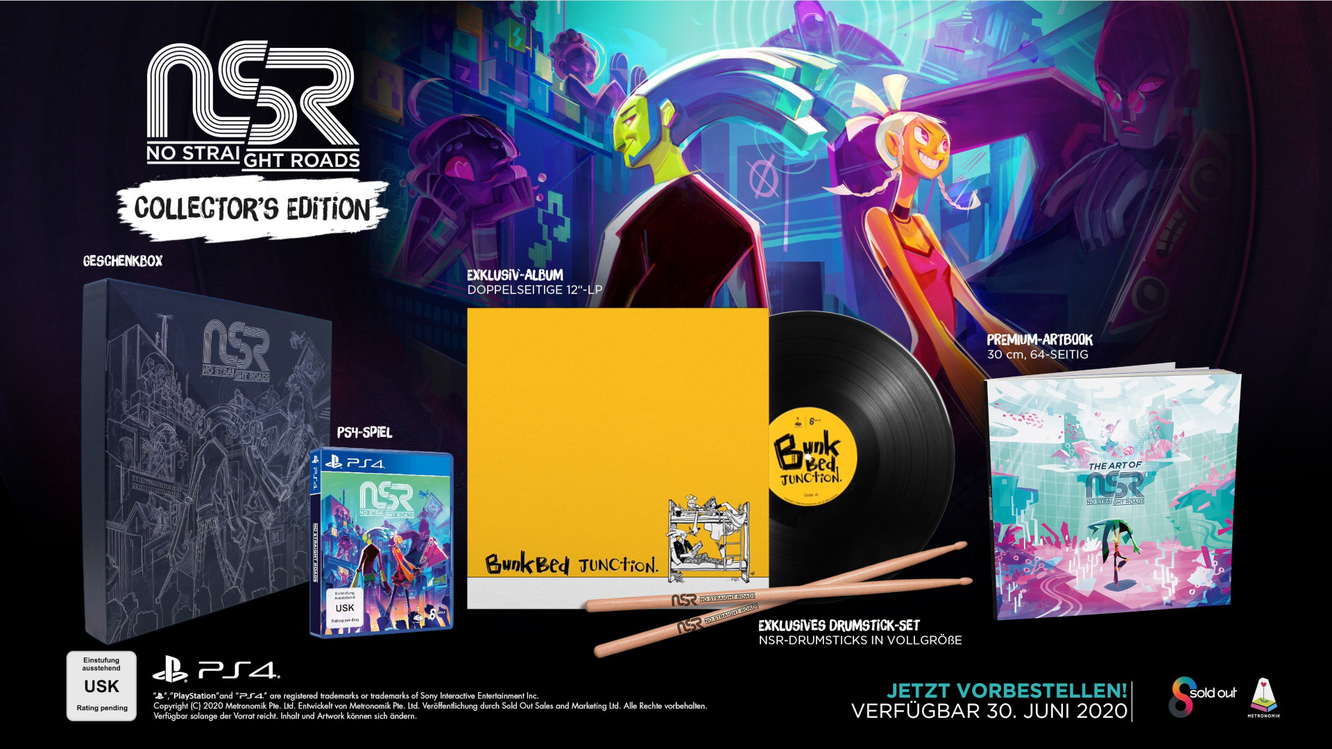 Sold Out und Metronomik bieten zusätzlich eine dicke Collector’s Edition zu No Straight Road an. Passend zum Spielort Vinyl City, wird diese eine doppelseitige LP mit dem Soundtrack des Spiels beinhalten. Zusammen mit einem Artbook und einem Set Drumsticks können Musikfreund_innen also auch in die No Straight Roads Welt abtauchen, ohne vor dem Bildschirm zu sitzen. Wer also etwas tiefer in die Tasche greifen möchte, findet für 69,99€ hier vielleicht eine lohnende Investition.