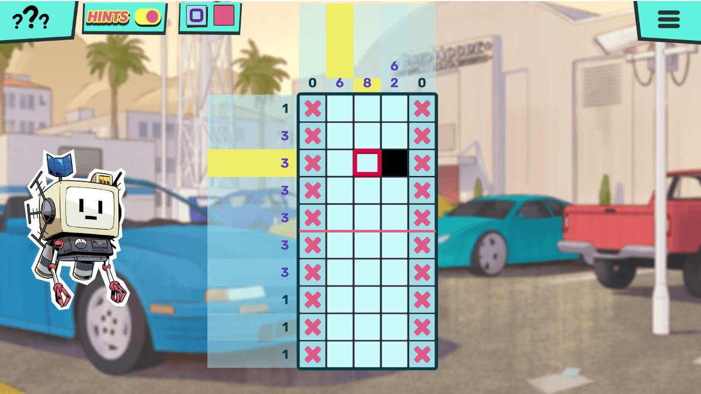 Picross meets Visual Novel im knalligen 90er Jahre Stil. Reicht nicht? Einen niedlichen Roboter gibt’s in Murder by Numbers obendrauf.