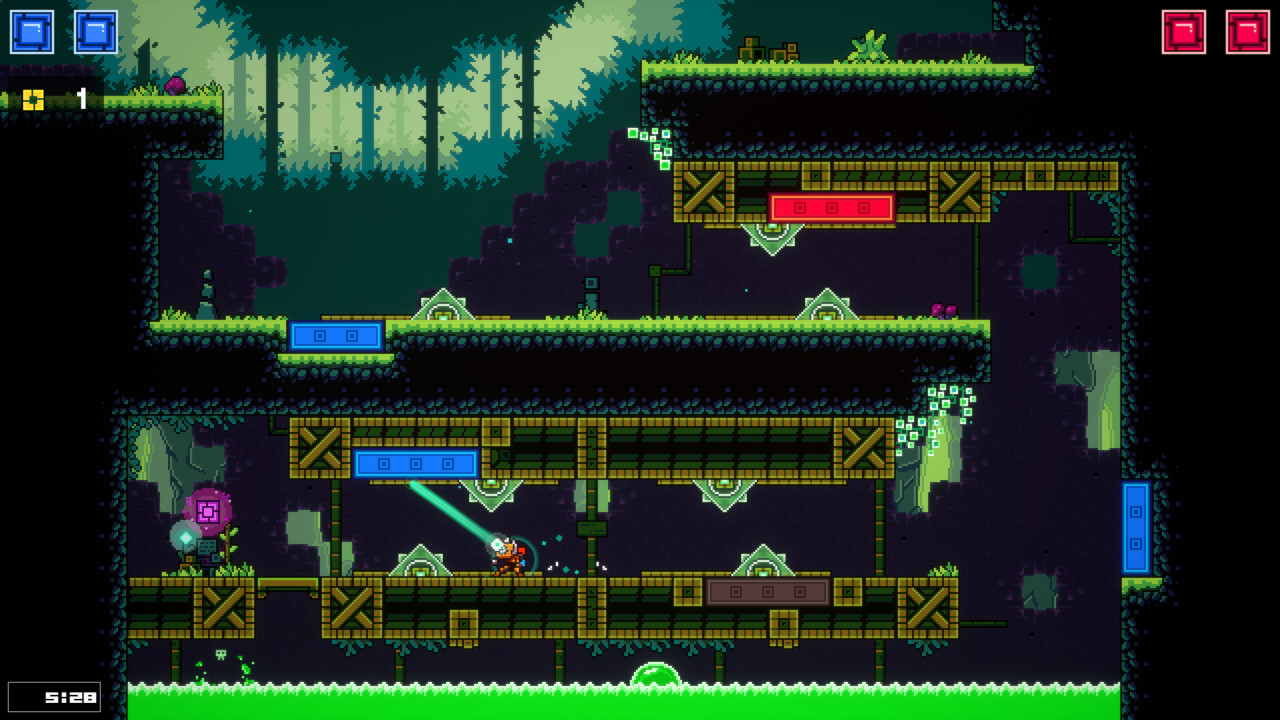 Denn dies geschieht mit unterschiedlich eingefärbten Plattformen, die Super Magbot abstoßen oder anziehen. Er muss dann nur die richtige Richtung einschlagen, um sich von positiv und negativ aufgeladenen Wegpunkten entlang zu hangeln. Die Herausforderung besteht hierbei in den Super Meat Boy-artig designten Level, die mit allerlei Säurebädern, Stacheln und Kreissägen aufwarten.