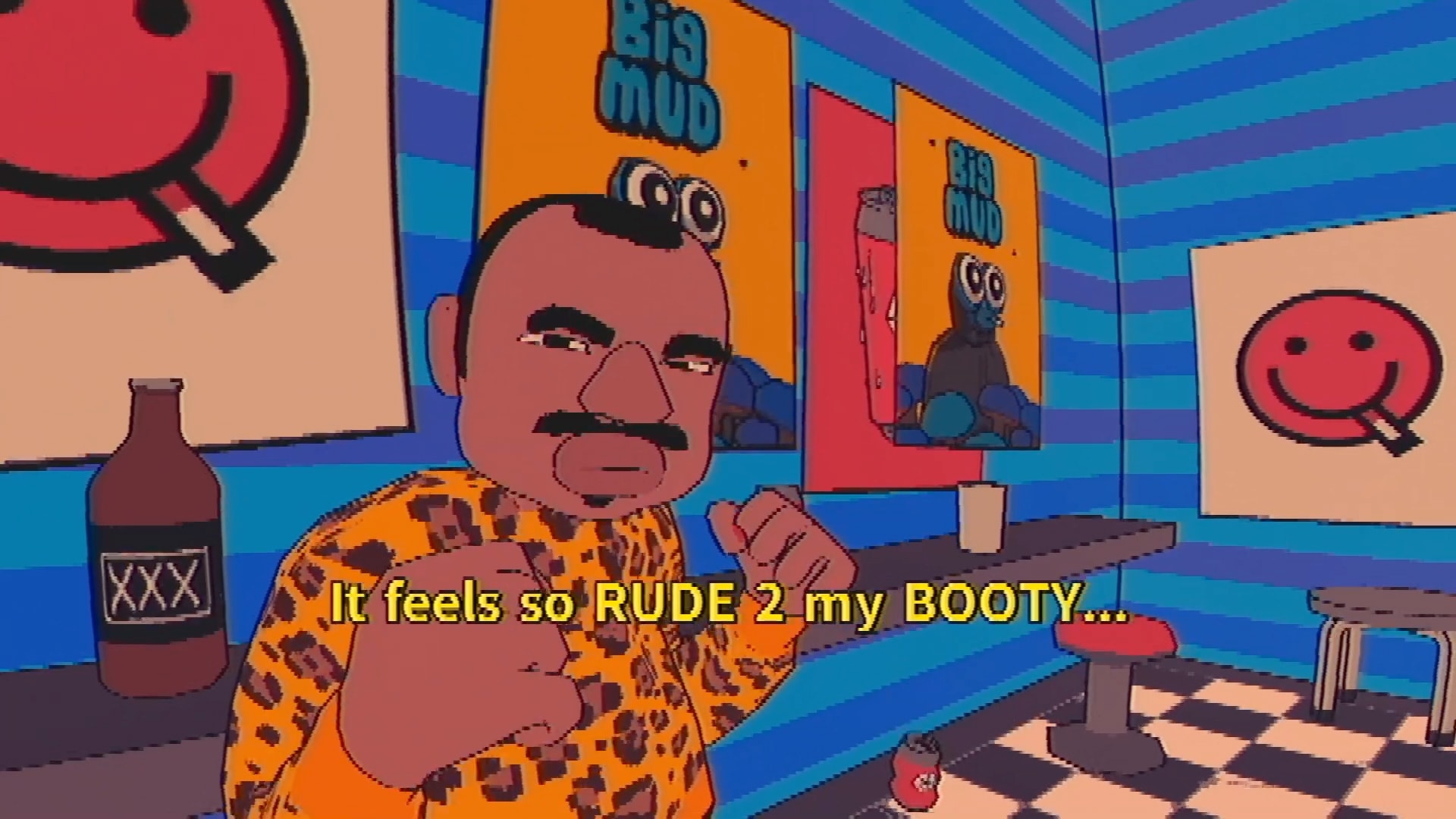 Warum die Katze zwei Polöcher hat und Ciggy raucht, weiß keiner. Auch nicht warum das Fitnesscenter statt Türen klaffende Löcher in den Wänden aufweist (wahrscheinlich, damit die breiten Muskelkörper durchpassen).