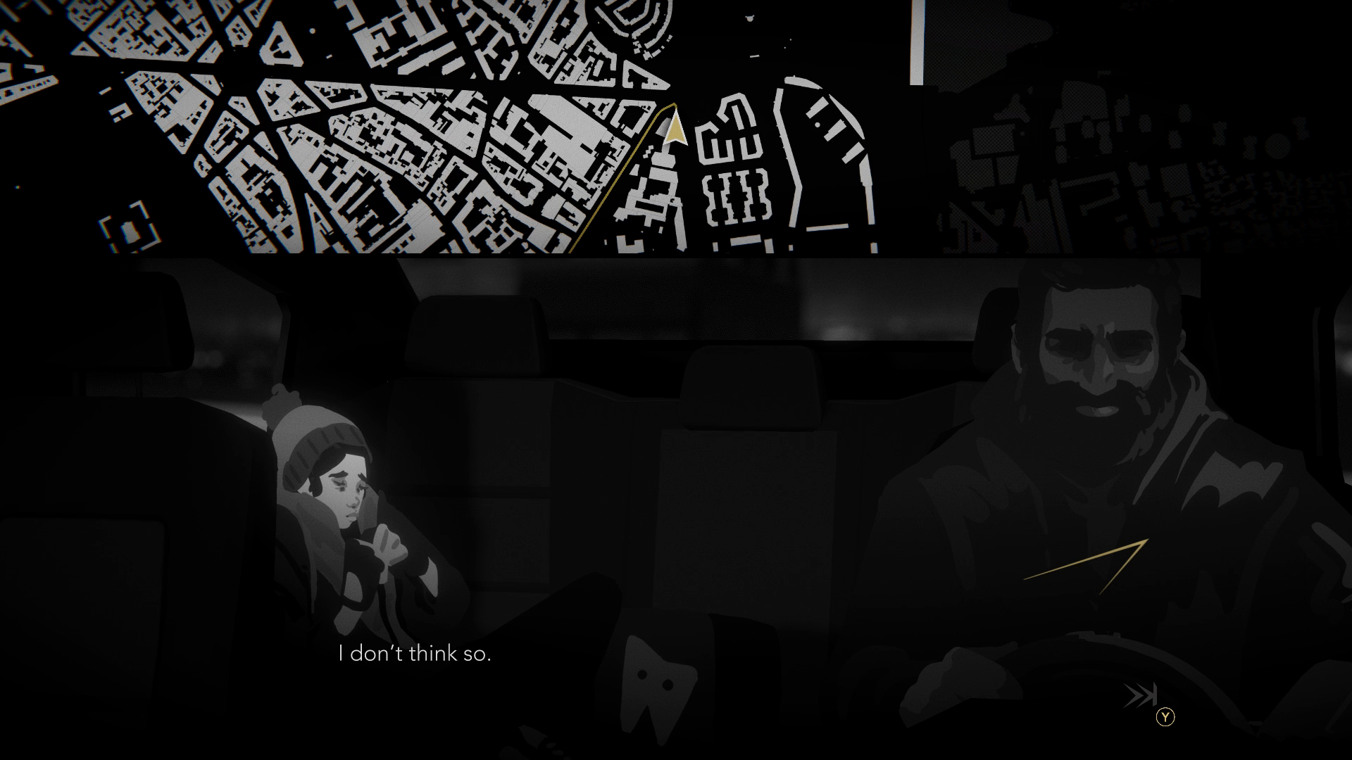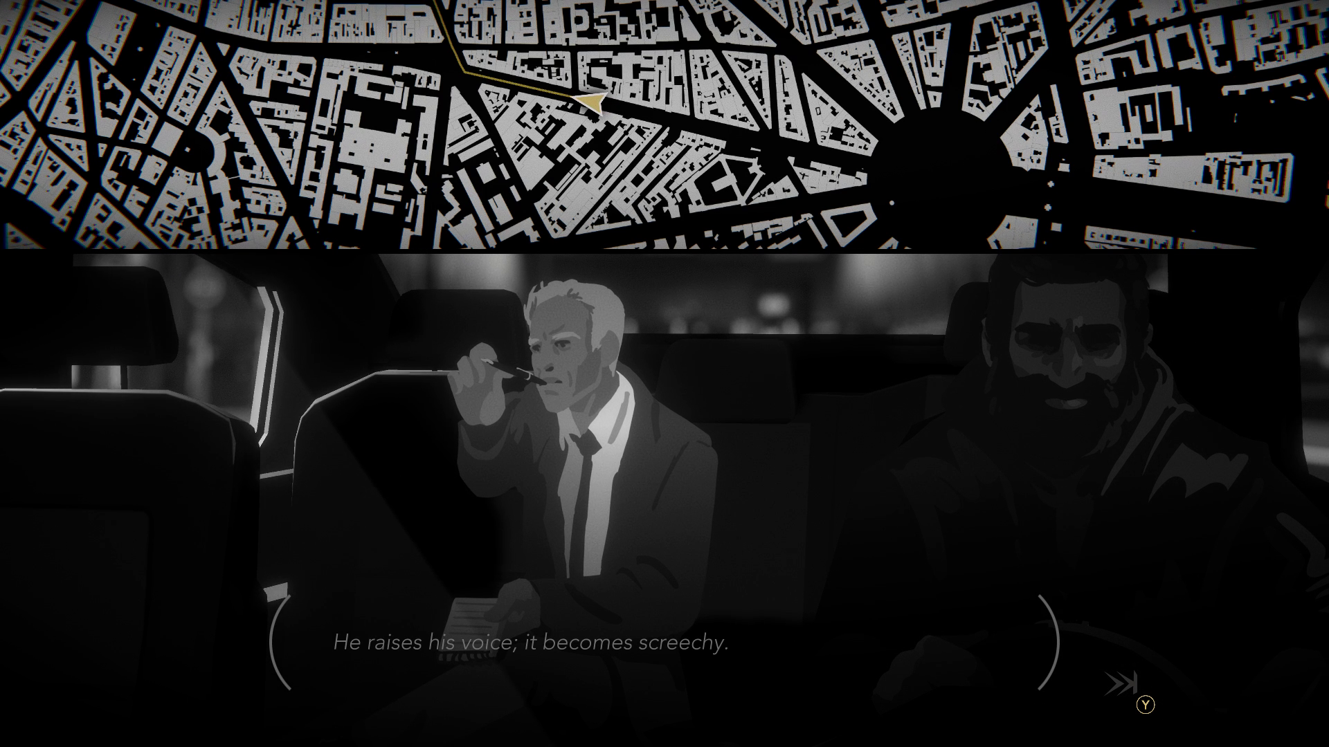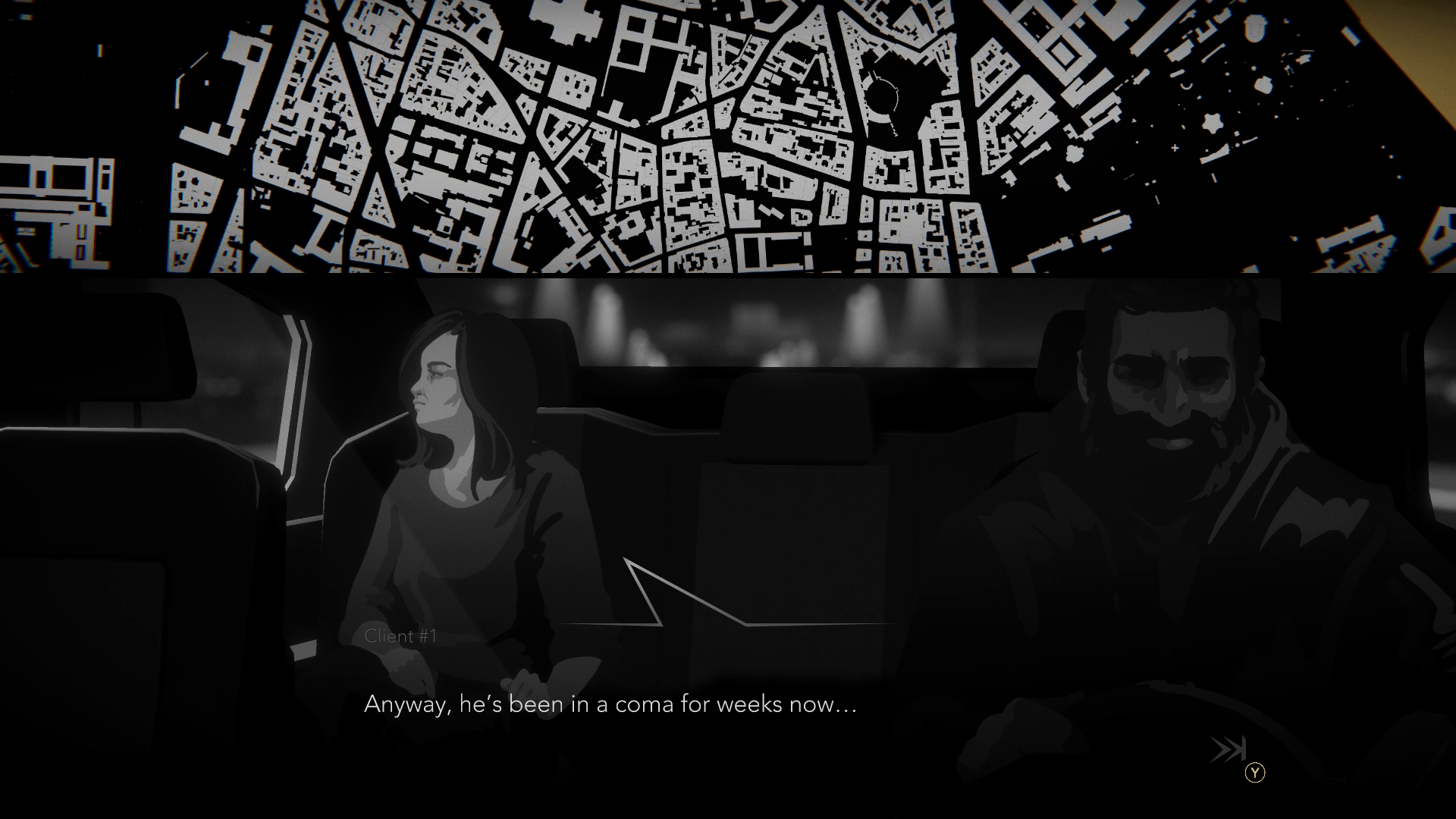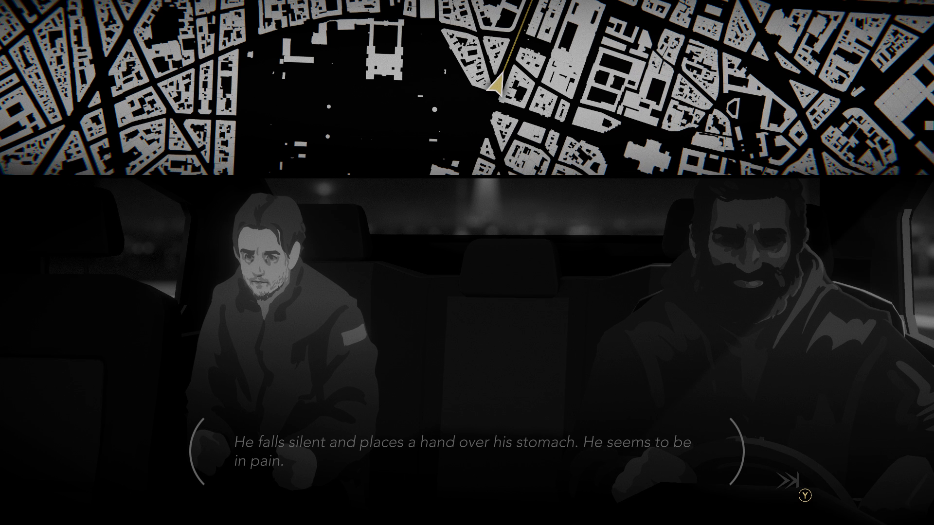 Night Call setzt den gezeichneten und traumatisierten Protagonisten zurück in sein Taxi. Zurück an den Ort, an dem er von dem Serienkiller attackiert wurde. Zurück auf die Straßen der so unvorhersehbaren Pariser Nacht. Nie kannst du dir wirklich sicher sein, welche Geschichte du als nächstes zu hören bekommst, welche Informationen eventuell dazu beitragen den Killer ausfindig zu machen. Schnell bemerkst du, ungefähr jede_r hat etwas zu den Serienmorden zu sagen und jede_r schleppt sein_ihr eigenes Päckchen durchs Leben. Die Developer interessieren sich nicht wirklich für das Verbrechen. Hinweise generieren sich automatisch und erscheinen nach Sichtung der Akten auf deiner Verdächtigentafel. Groß sinnieren, zusammenfügen, rekonstruieren, musst du nicht. Es ist zwar möglich das Verbrechen allumfänglich aufzuklären. Doch in dieser schwarz/weißen Visual Novel ist nicht der vorgeschobene Kriminalfall das große Thema, sondern die vielfältigen Geschichten deiner Fahrgäste.