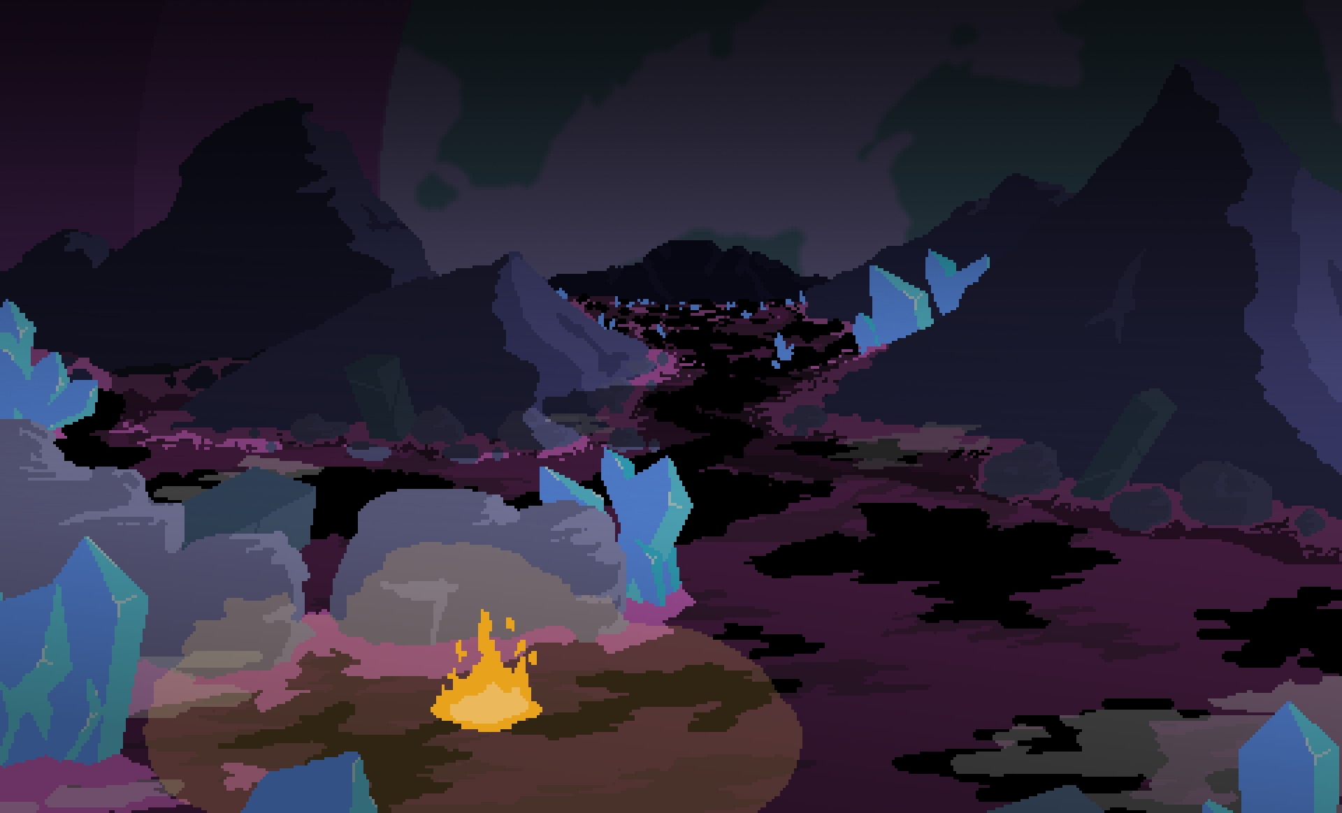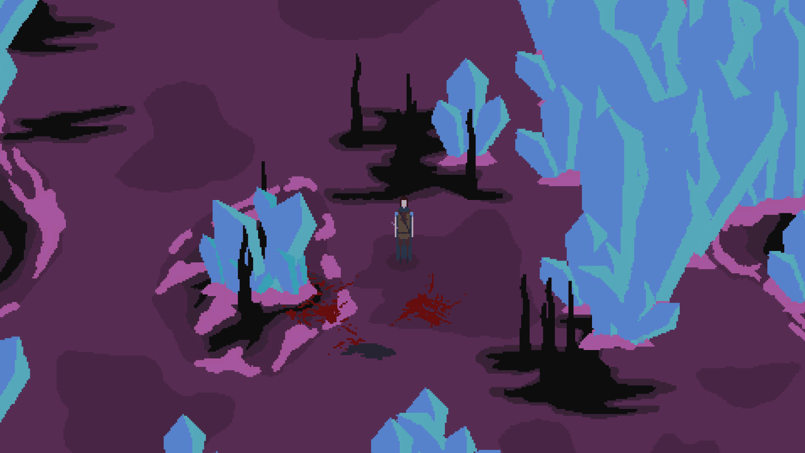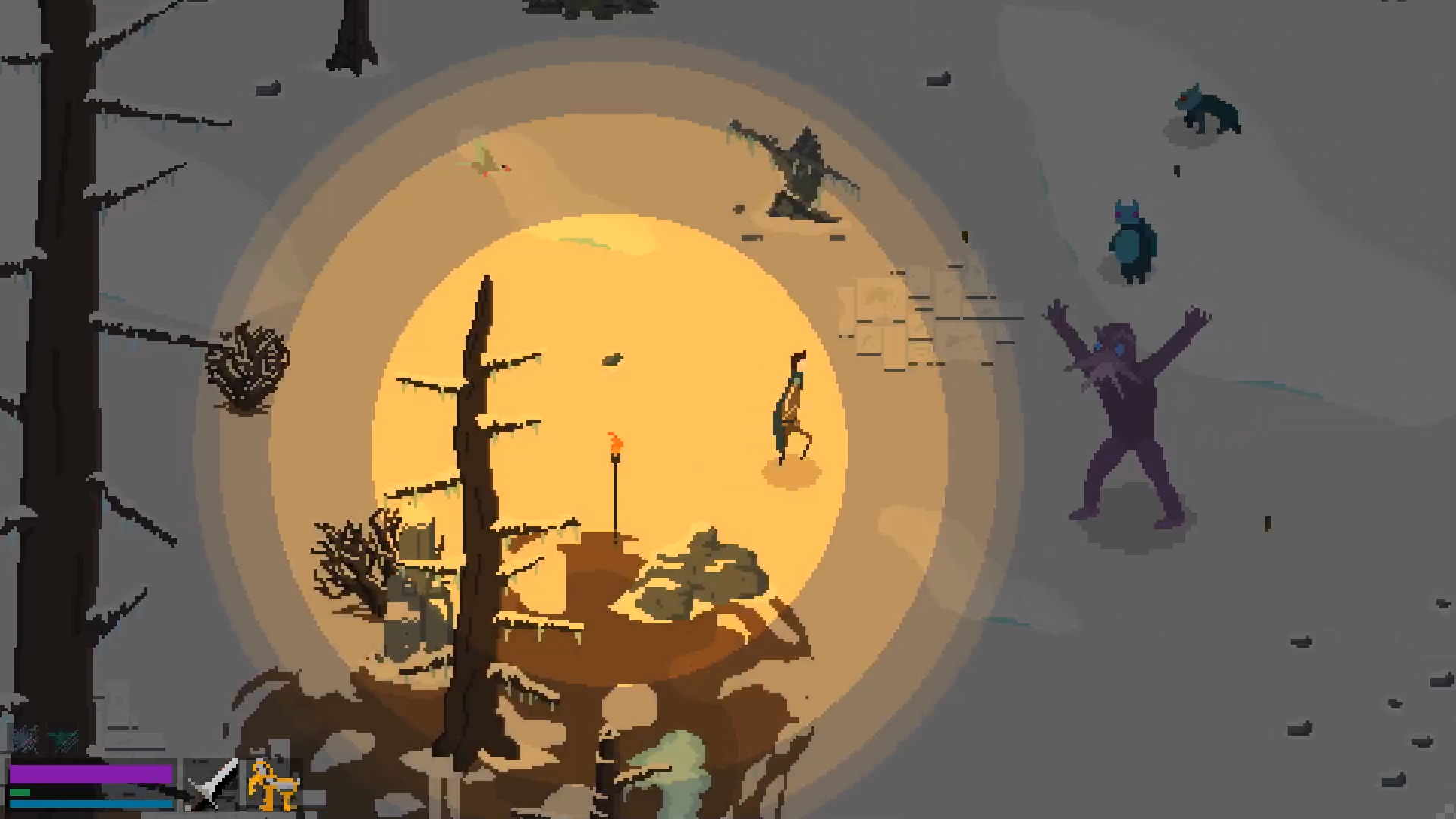 Ihr steht oft in einer Umgebung, die sich trotz Vogelperspektive zur besseren Übersicht einfach unfassbar ähnelt. Gerade die düsteren Waldgebiete lassen euch ziellos umherirren. Stellt euch darauf ein, mehrmals an derselben Holzfällerhütte zu landen, vor der die verwesenden Monsterkadaver liegen, die ihr einige Minuten zuvor dort hinterlassen habt. Eldens gemächliches Tempo macht diese wiederholten Entdeckungen noch frustrierender. Ab und zu tauchen Buttonprompts auf, die euch zeigen, dass ihr einen Knopf drücken könnt, um nun Magie zu wirken oder ein Schild zu lesen, welches ihr nicht versteht. So habt ihr immerhin die Information, dass in dieser Richtung etwas Interessantes sein könnte. Das hält euch jedoch nicht davon ab, an der nächsten Kreuzung wieder falsch abzubiegen und einen langgezogenen Bogen zu spazieren. Die eher reduzierte Pixeloptik erschwert es merklich, klar erkennbare Einzelheiten in der Umgebung auszumachen. Habt ihr diesen Ort schonmal besucht oder sieht es nur so aus wie die Gabelung zuvor?