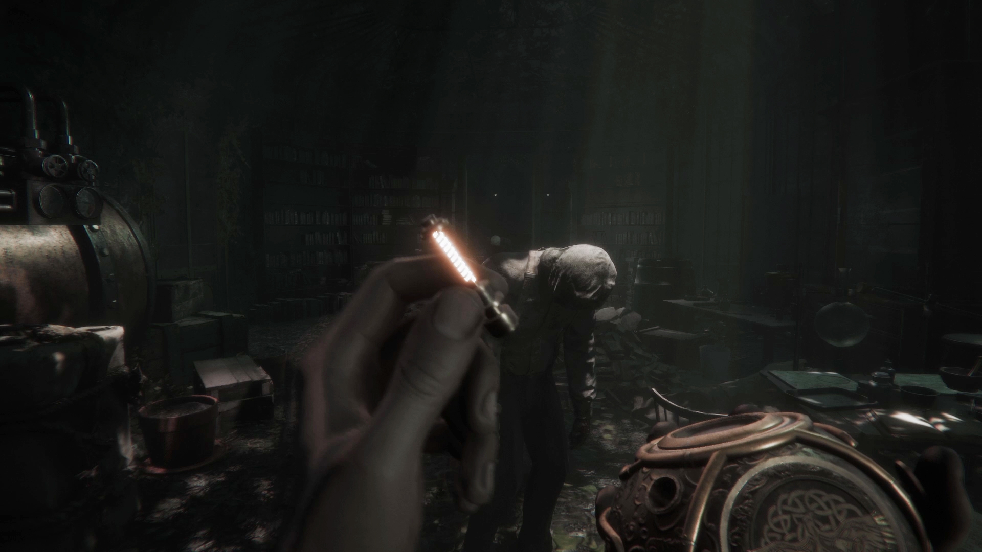 Auf dem Gelände des Hotels befinden sich vier Musikzylinder, die ich finden muss, um sie in die große Orgel der Eingangshalle zu setzen. So kann ein Lied gespielt werden, das alle Menschen des Anwesens rettet. Diese stromern blind durch die Gänge und reagieren aggressiv auf jedes noch so kleine Geräusch, das Thomas verursacht. Ich darf mich auf meiner Suche also nicht erwischen lassen, verstecke mich in Ecken der Gänge und halte bei Bedarf die Luft an, damit mein Atem keine Aufmerksamkeit erregt. Flackernde Kaminfeuer oder große Staubwolken lassen mich husten, so dass auch hier die Luft angehalten werden muss. Tue ich das jedoch zu lange, verschwimmt die Sicht vor meinen Augen und ich keuche beim ersten Atemzug laut auf, wenn die Luft wieder in Thomas Lungen strömt. Zum Glück kann ich sehr gut hören, wie nah oder weit entfernt die mysteriösen Gestalten durch die Gänge des Hotels stampfen.